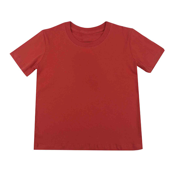 Футболка детская красного цвета выполнена в классическом стиле с короткими рукавами и круглым вырезом горловины. Модель отличается простым и универсальным дизайном без принта, что делает ее идеальной основой для повседневного гардероба.