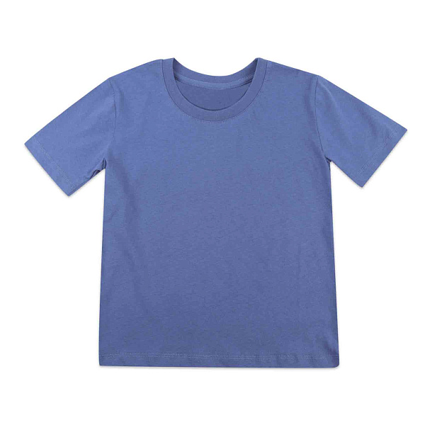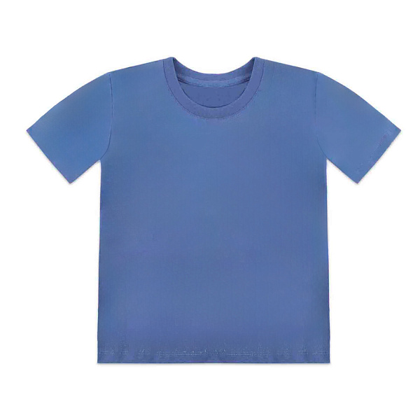 Футболка детская синего цвета выполнена в классическом стиле с короткими рукавами и круглым вырезом горловины. Модель отличается простым и универсальным дизайном без принта, что делает ее идеальной основой для повседневного гардероба.