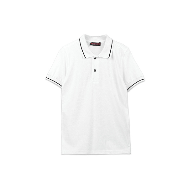 Футболка-поло порадует маленького непоседу и чудесно подойдет для активных игр или занятий спортом. Ткань на основе натурального хлопка мягкая и приятная к телу, материал хорошо пропускает воздух и влагу, обеспечивая комфорт в носке. Свободный крой и короткие рукава не сковывают движения. Низ рукавов дополнен тонкими резинками с черной полосой. Вырез горловины треугольный, имеется небольшой воротник, декорированный черной линией. Под вырезом имеется застежка из двух пуговиц и маленькая белая нашивка. Рекомендовано для детей дошкольного и школьного возраста.