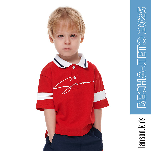 Футболка-поло для мальчика выполнена в ярком морском стиле. Красный цвет ткани гармонично сочетается с белыми полосами на рукавах, создавая стильный и современный образ. Контрастный бело-черный отложной воротник добавляет облику завершенности. Надпись на груди придает изделию уникальность и подчеркивает тематику.
