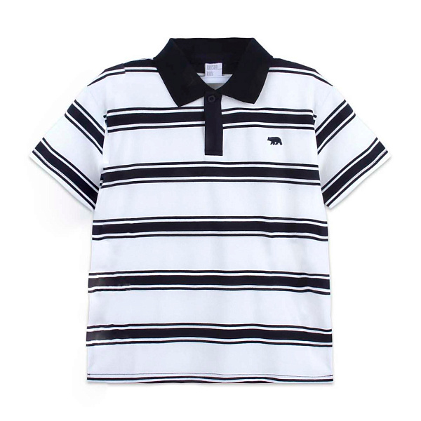 Футболка-поло пошита из хлопковой ткани с добавлением 5% эластана для большей прочности и эластичности. Она имеет свободный крой, короткие рукава и отложной воротник. Горловина застегивается двумя пуговицами. Футболка выполнена в белом цвете с черными горизонтально расположенными полосами.