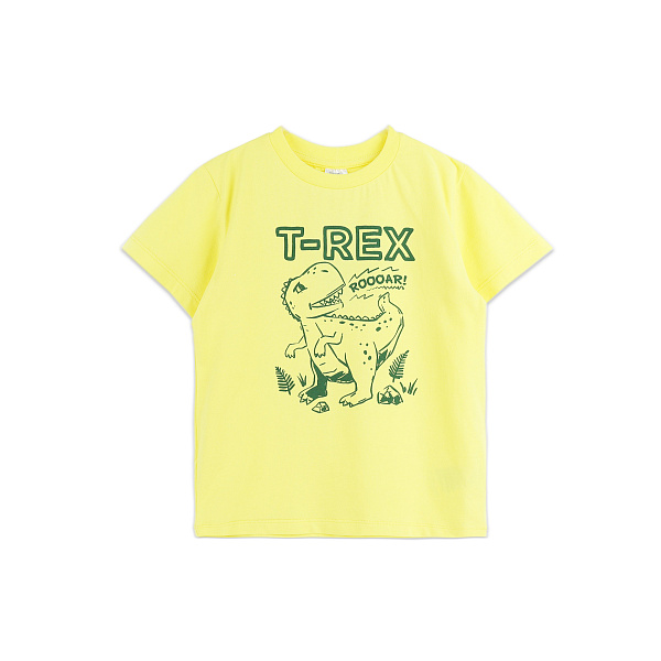 Яркий желтый цвет футболки привлекает внимание, а зеленый принт спереди с изображением динозавра и надписью T-rex придает изделию стильный и игривый вид. Этот дизайн понравится мальчикам, увлеченным динозаврами и приключениями.