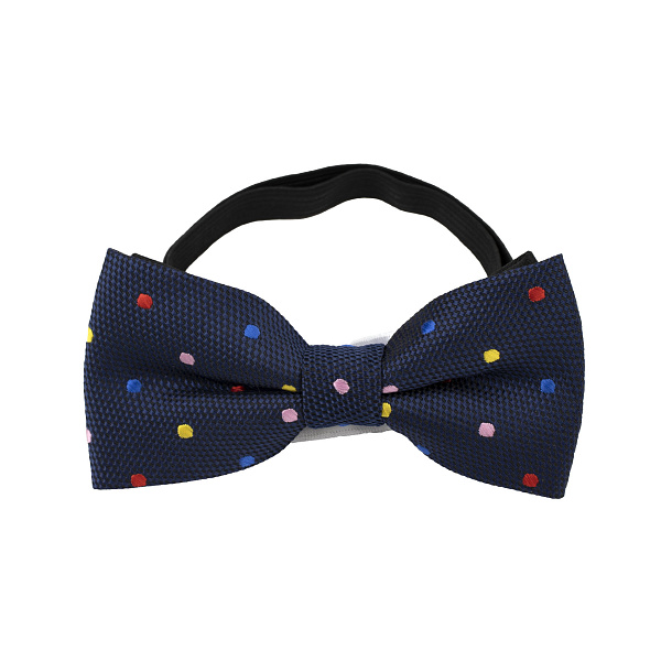 Галстук на резинке в виде бантика из темно-синей фактурной ткани понравится каждому мальчику. Забавный детский аксессуар выглядит очаровательно благодаря декору с использованием вышивки. А крупный синий бант зафиксирован перемычкой и украшен цветными горошинами, вышитыми на машинке, которые создают игривое и позитивное настроение.