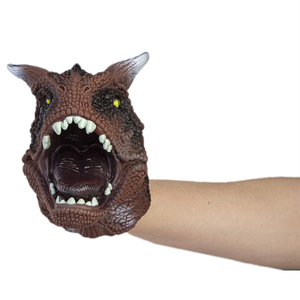 Игрушка с великолепной детализацией морды зверя подойдет в качестве перчатки на руку. Она выполнена в форме головы динозавра, отрисованного в ярких красках.