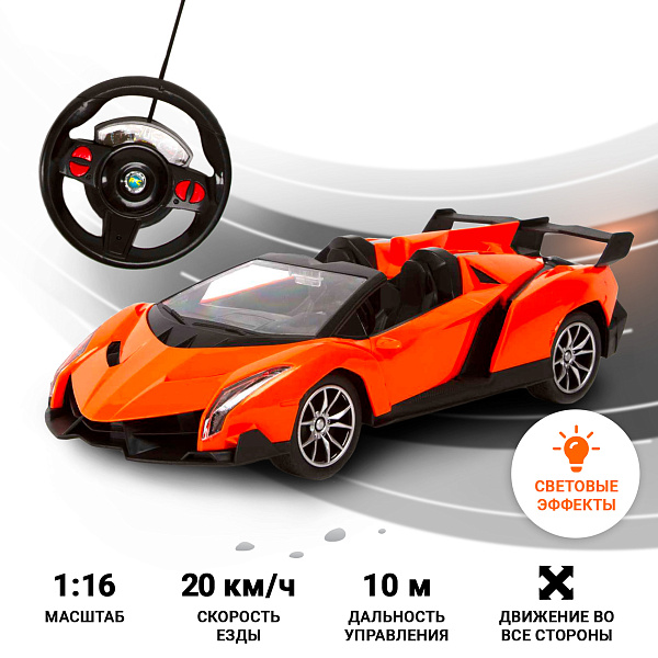 Радиоуправляемая модель гоночного автомобиля представлена в масштабе 1:16. Яркий автомобиль оранжевого цвета может стремительными темпами передвигаться по любой ровной поверхности, демонстрируя устойчивость и обеспечивая плавность перемещения во всех направлениях. Он обладает молниеносным ускорением и стремительной манёвренностью, а хромовые диски на низкопрофильных шинах, спойлер и световые эффекты придают машине ещё большую реалистичность.