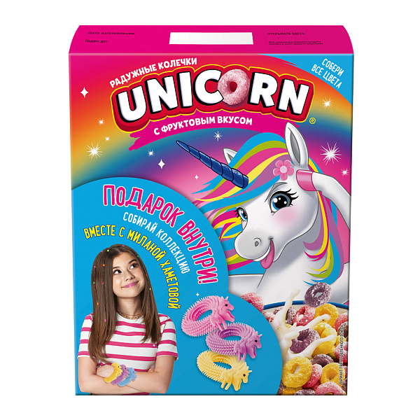 Готовый завтрак «Unicorn» – это хрустящие цветные колечки, изготовленные из набора питательных злаков, которые всего лишь нужно залить молоком или соком, чтобы получить вкусный, полезный и полноценный завтрак. Хрустящие колечки приготовлены без консервантов и некачественных ароматизаторов, они окрашены при помощи экстрактов ягод, фруктов и овощей, и несут в себе пользу природы. Такой завтрак ребенок может приготовить себе сам, а разноцветная картонная коробка с игрой на обратной стороне и коллекцией переводных картинок внутри только поспособствует проявлению самостоятельности. В коробке 195 граммов хрустящих колечек – хватит надолго. Порадуйте своего ребенка полезным и вкусным завтраком.