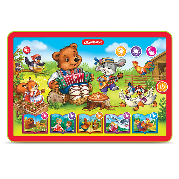 Полезным и увлекательным приобретением для девочек и мальчиков с трехлетнего возраста станет интерактивный планшет. Яркая картинка со сказочным сюжетом привлечет внимание малыша. Нажав на экран устройства, ребенок прослушает поочередно 5 известных сказок, народные потешки, самостоятельно поиграет в «Чей голос», отгадает загадки.