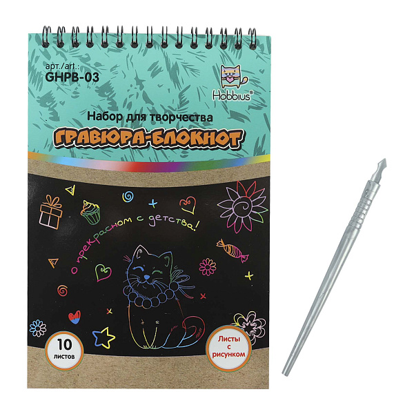 Оригинальный гравюра-блокнот с нанесенным рисунком. На разноцветные листы нанесен дополнительный черный слой. Аккуратно счищая его, можно создавать оригинальные поделки. Сюжеты ограничены только воображением ребенка. Готовое изображение выглядит очень необычно: разноцветный рисунок на черном фоне. В набор входит блокнот с десятью страницами и металлический штихель для выцарапывания картинок.