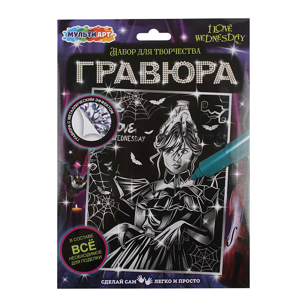 Гравюра Мульти Арт «Венсдей» — увлекательный набор для творчества с металлическим эффектом. Этот набор станет отличным способом для развития навыков мелкой моторики и творческого мышления у ребенка. Простая инструкция будет понятная детям от 3 лет. Размер картинки 18x24 см.