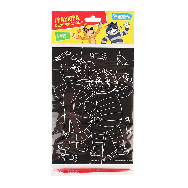 Основу гравюры украшает контурное изображение Кота Матроскина и его друга Шарика — персонажей известного мультфильма. После завершения работы фон за штрихами заиграет яркими красками, создавая необычный рисунок.