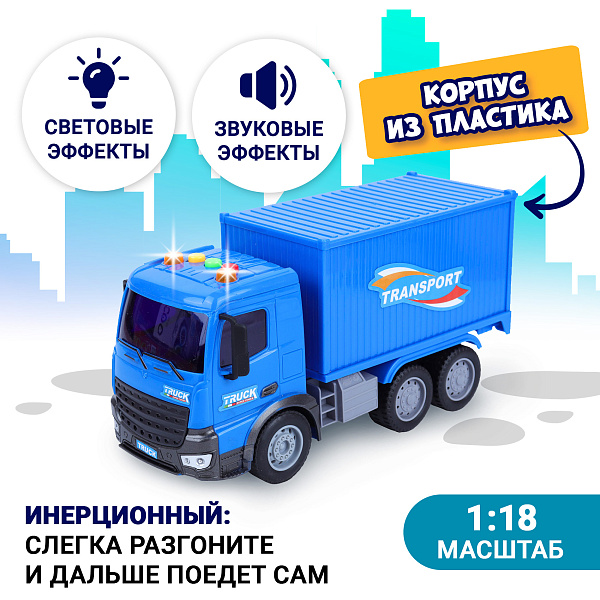 Большой игрушечный грузовик с инерционным механизмом в масштабе 1:18 представляет серию городских грузовиков. Тягач с контейнером выполнен их прочного пластика синего цвета и оснащен встроенным инерционным механизмом, а также звуковым модулем и подсветкой. Батарейки входят в комплект, паз для установки располагается на крыше тягача. Там же расположены цветные кнопки для включения света звука. У машины светятся фары и проблесковые маячки оранжевого цвета. Реалистичные звуки машины сделают игру более интересной. Контейнер можно открыть и поместить внутрь какой-нибудь груз для перевозки в процессе игры. Рекомендовано для детей старше 3 лет.