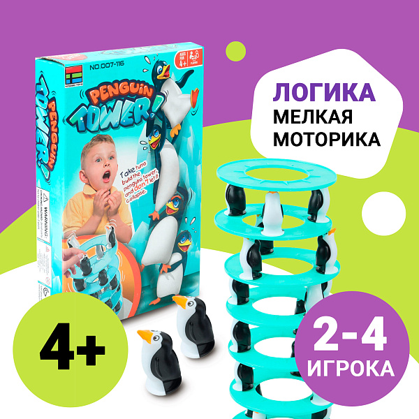 Настольная игра «Башня пингвинов» соберет вокруг себя только смелых и ловких ребят. Стая пингвинов потеряла дорогу домой. Холодает. Пингвины прижались друг к другу, чтобы сохранить тепло. Миссия игроков – помочь им построить башню, чтобы с высоты пингвины нашли обратный путь. Соберите самую высокую баню пингвинов до того, как она упадет – ставьте колечки на пингвинов. Но следите, чтобы башня не рухнула! Кто сломает – тот проиграет!
