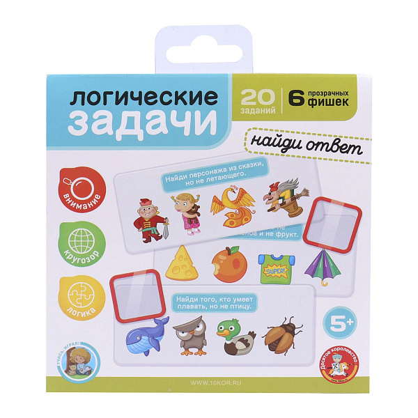 Игра «Логические задачи: Найди ответ» предлагает вашему малышу 20 увлекательных карточек с заданиями, которые помогут развивать логическое мышление и внимание. Набор оформлен в ярких и привлекательных цветах, каждая карточка содержит изображения различных предметов, животных и сказочных персонажей. В комплекте также имеется 6 прозрачных фишек для обозначения правильных ответов.