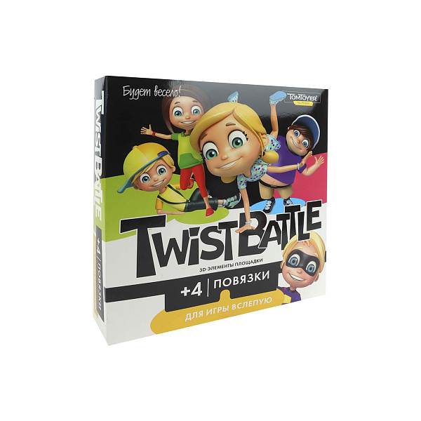 «Twist battle» — это активная игра, которая понравится взрослым, и детям. В набор входит игровое поле, рулетка и четыре повязки для глаз. Правила очень просты: участники по очереди крутят колесо, а затем ставят руку или ногу туда, куда оно укажет. На рулетке есть обозначения: рука/нога, левая/правая, а также цвет элемента. Выигрывает тот, кто остался стоять на поле последним.