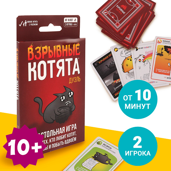 Мини-версия уже полюбившейся игры «Взрывные котята» в формате дуэли – это прекрасный вариант развлечения на двоих. Правила в ней все те же: главное – не вытянуть карту с взрывным котёнком. Для этого используются карты действий, позволяющие избежать взрыва и направить его на других игроков. Побеждает тот, кто останется последним в игре.