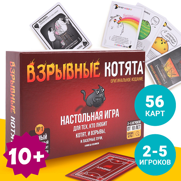 Игра развивает у детей внимание, быстроту реакции и стратегическое мышление. Игра «Взрывные котята» подходит для совместного семейного веселья уютными вечерами, а также станет развлечением для компании детей старше 10 лет. Количество игроков: от 2 до 5.