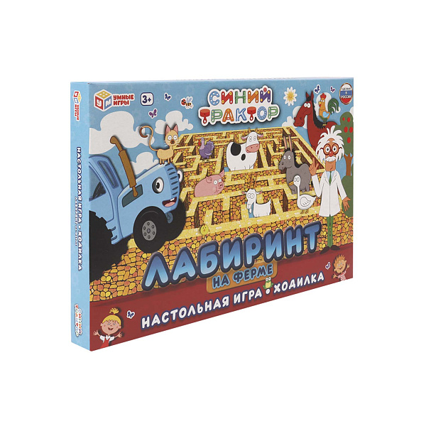 Настольные «ходилки» – популярные игры во всем мире, они имеют множество вариантов. Игра «Лабиринт на ферме» относится к серии «Синий трактор». В комплекте: игровое поле, четыре фишки, кубик и правила игры.