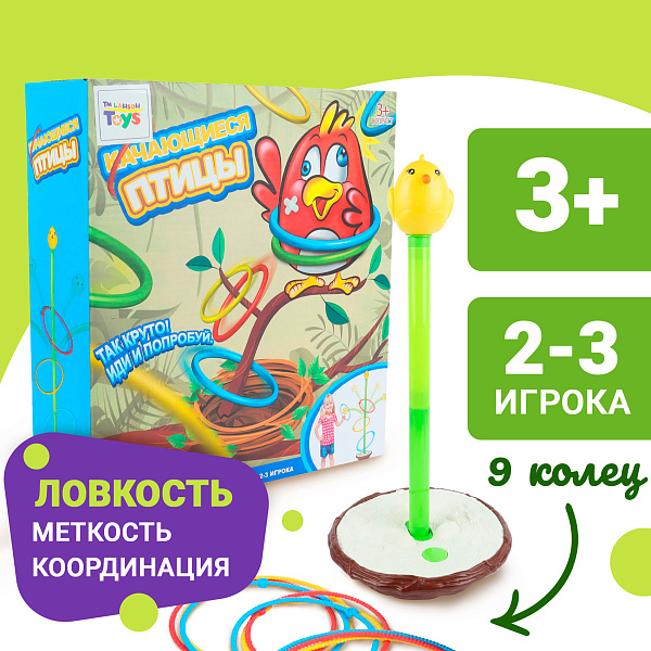 Эта веселая и увлекательная игра проверит меткость и координацию движений. Она имеет простые правила – нужно попасть кольцом в пластиковый стержень с головой птицы. Задача усложняется тем, что стержень не стоит неподвижно, он покачивается с помощью скрытого в изображающей гнездо подставке механизма.