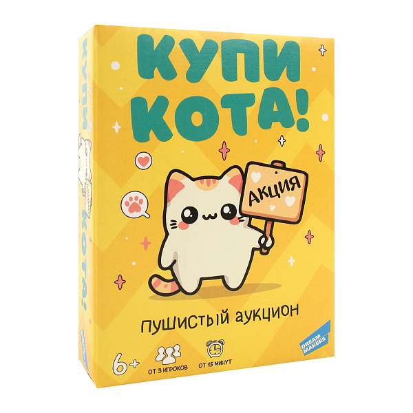 Настольная игра «Купи кота» — веселая и быстрая игра-торги с карточками. В наборе представлены карты с изображениями забавных котиков восьми разных видов, а также две специальные карты. Цель игры – собрать девять одинаковых карточек с котиками и набрать 500 очков.