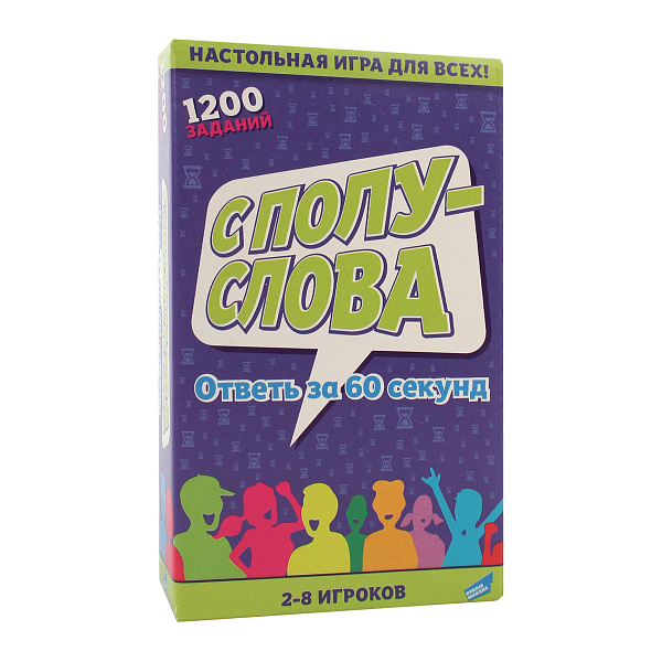 Настольная игра «С полуслова» — быстрая и веселая игра на угадывание слов. В набор входят 75 карточек со словами и песочные часы. Все карточки выполнены из плотного картона. Игра рассчитана на 2–8 игроков, подходит для детей от 6 лет.