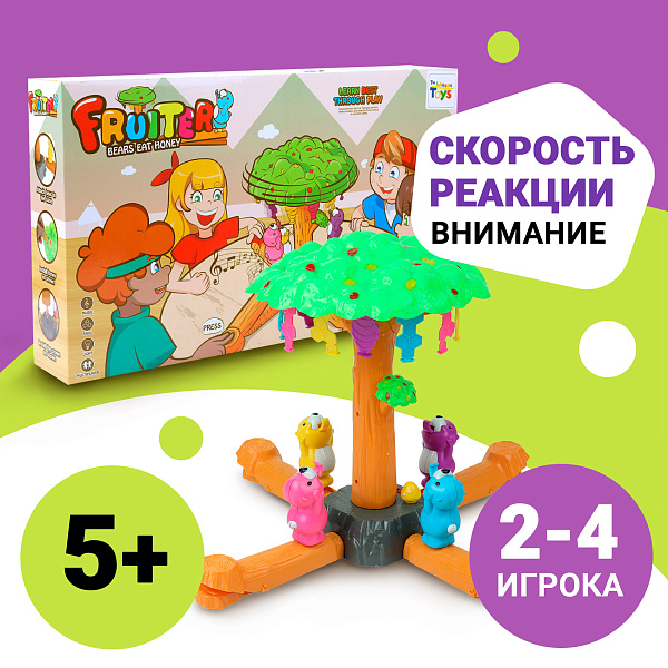 Увлекательная настольная игра «Фруктовое дерево. Охота на мед» порадует активных и непоседливых детей. Готовы решить, кто среди команды самый ловкий и быстрый? Тогда скорее начинайте игру! Игра состоит из дерева, вокруг которого бегают мишки. На ветвях висят медовые соты, и задача игроков – помочь медведю ухватить мед. Победитель тот, кто поможет мишке набрать как можно больше сот. Световые и звуковые эффекты вносят особую атмосферу в игру.