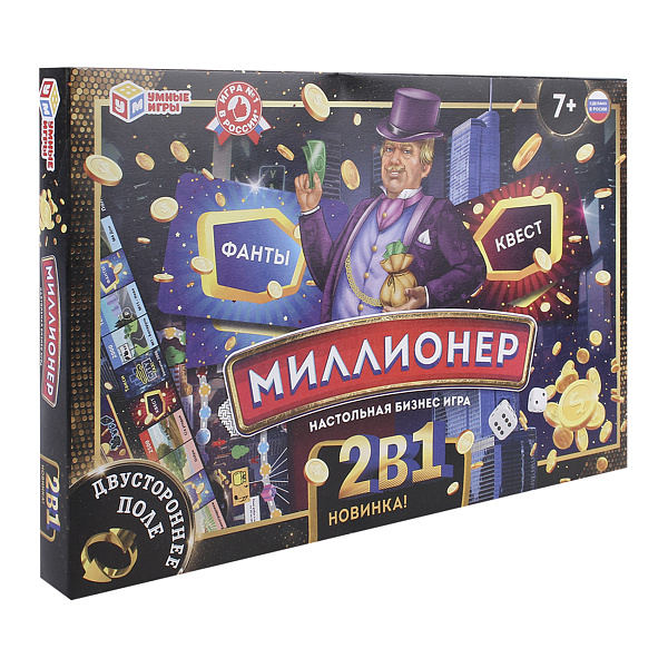 Настольная игра «Миллионер 2в1: Квест и Фанты» предлагает увлекательное путешествие в мир бизнеса и приключений. Игра содержит двустороннее игровое поле размером 42x58 см, обеспечивающее разнообразие сценариев и возможностей.