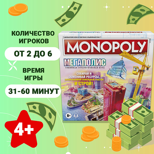 В настольной игре Монополия «Мегаполис» вас ждет неожиданный стратегический поворот: в центре игрового поля находится Остров Монополии! Игроки путешествуют по карте, скупая недвижимость и собирая ренту и ресурсы, а с помощью блоков они строят собственный островной город! Чем больше игрок строит, тем больше очков он зарабатывает. Игра заканчивается, когда завершается строительство пентхауса.