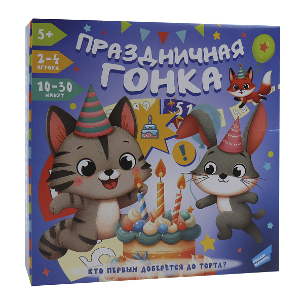 Настольная игра «Праздничная гонка» — это яркая и веселая ходилка в синей коробке с изображением котенка и зайчика в праздничных шапочках, где игроки бросают кубик и движутся по игровому полю, выполняя задания на карточках и получая наклейки за успех. Цель игры — первым добраться до клетки «Финиш», что создает азарт и мотивацию для детей от 5 лет.