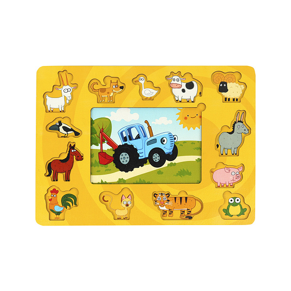 Развивающая игрушка с персонажами из мультика «Синий трактор» порадует маленьких поклонников мультсериала. Изготовленная из дерева, рамка включают в себя несложную мозаику и несколько деревянных вкладышей с изображением животных. С ее помощью дети развивают моторику, логику, любознательность и воображение. Вытащите все вкладыши и предложите малышу вернуть их на место, но вначале продемонстрируйте, чего вы ждете от ребенка. Он должен сопоставить картинки и только после этого попытаться поставить вкладыши на место.