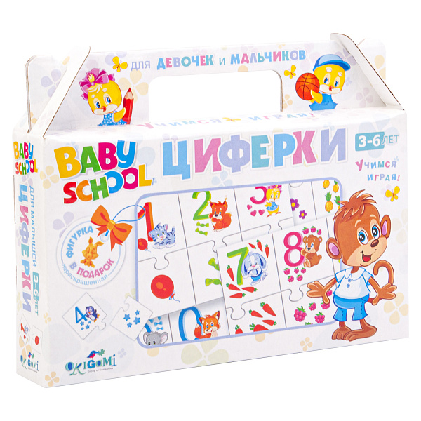 Для обучения малышей с 3 до 6 лет счету и математическим действиям подойдет игровой набор «Циферки», в который входят паззлы с яркими цветными картинками, соединяющимися попарно. На одной из карточек изображена цифра с красочной подсказкой, на другой стороне – количество предметов, соответствующее этой цифре. Играть с такими паззлами сможет даже малыш, который еще не знаком с цифрами и счетом.