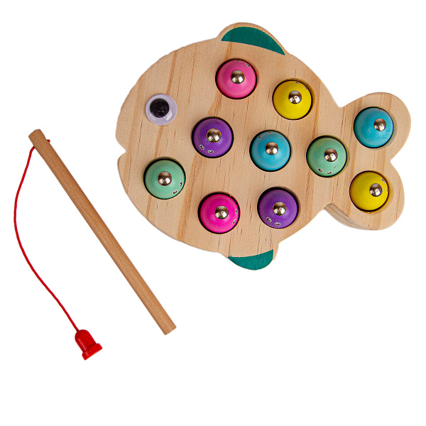 Игра-рыбалка способствует развитию мелкой моторики, ловкости, зрительного восприятия, координации движений. Основание игрушки выполнено из натурального неокрашенного дерева. В специальных глубоких отверстиях расположены яркие деревянные рыбки с небольшими магнитами на верхушке. Суть игры заключается в ловле рыб с помощью удочки с магнитным наконечником на веревке. Игрушка разработана на основании игр по системе Монтессори. Товар предназначен для детей с 3 лет.