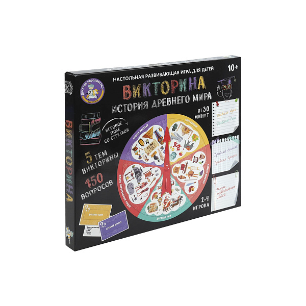 Тематическая настольная игра будет интересна детям старше 10 лет. Она послужит проверкой знаний по истории, поможет весело и с пользой провести время. В набор входит игровое поле с подвижной стрелкой и 150 карточек с вопросами. Одновременно принять участие в викторине могут от 2 до 4 человек. Максимальное количество баллов наберет самый эрудированный участник.