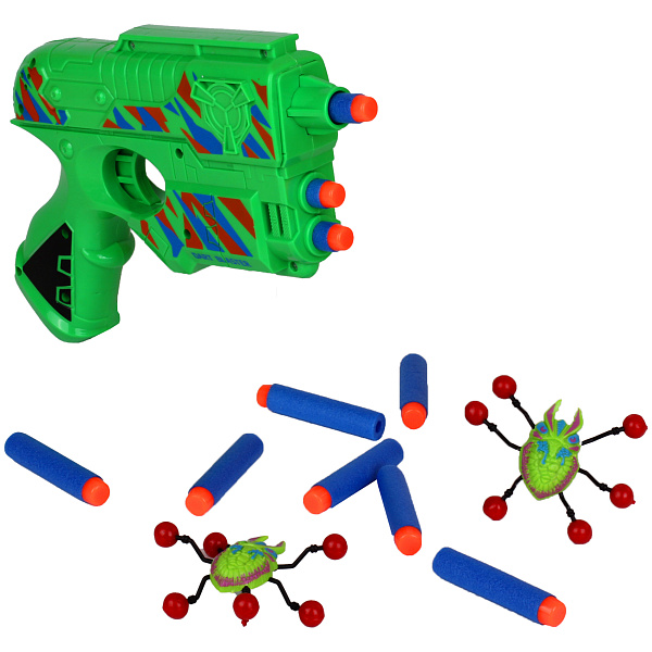В игровой набор входит комплект из шести поролоновых пулей, мишеней в виде жучков и само оружие. В каждом заряде подразумевается использование сразу трех пуль – это увеличивает шансы на точное попадание. Мягкие поролоновые пули безопасны для детского использования и не оставят на ребенке синяков даже если попадут в «цель». Маленькие ярко-зеленые жучки разнообразят игру и дадут преимущество в битве.