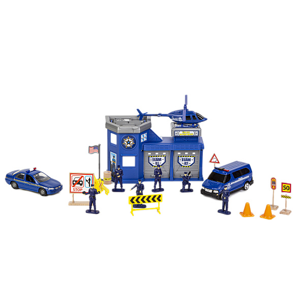 В наборе собрано 20 деталей – так, в красочной коробке находятся здание полиции, 2 гаражных отсека с поднимающимися дверями-ролетами, вертолет для наблюдения, легковая машина и микроавтобус для задержки и перевозки нарушителей закона, а также 6 человечков в форме стражей порядка с оружием и специальные оградительные знаки. Единственная подсказка — американский флаг, и с него можно начать захватывающий сюжет.