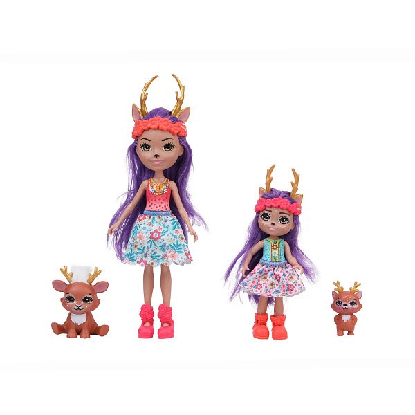 Замечательный игровой набор Enchantimals для девочек развивает воображение ребенка, прививает семейные ценности. В состав набора входят две куклы, изображающие сестер – Данессу Оленни и ее сестру Данетту, а также фигурки лесных оленят. Этими персонажами можно разыгрывать увлекательные сценки, придумать свой фантастический мир. У кукол-сестер оригинальная красочная одежда в едином стиле и съемные аксессуары венков и оленьих рожек.