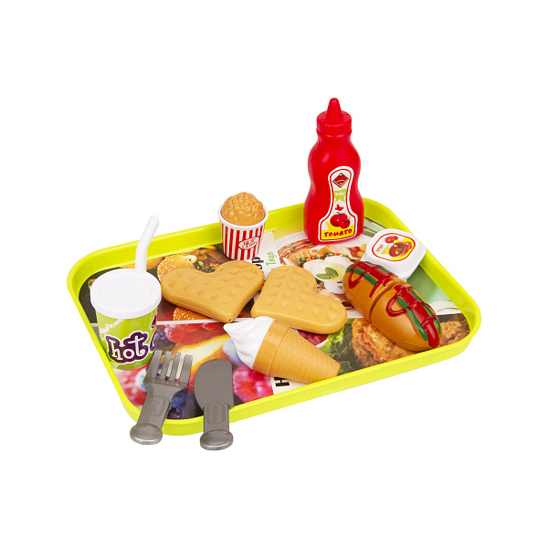 Красочно оформленный и прекрасно детализованный набор для увлекательной игры в кафе быстрого питания. В набор входит специальный поднос, вилка и столовый нож, хот-дог, коробочка с соусом, бутылка с кетчупом, ведерко попкорна, две венские вафли в форме сердечка, рожок с мороженым.