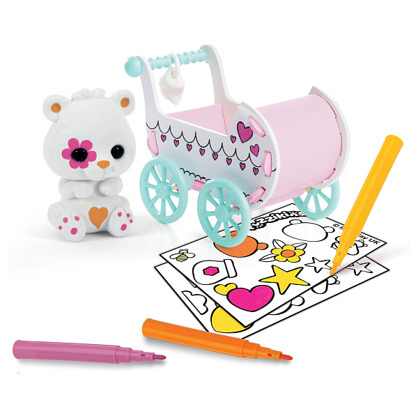 Здесь все собрано в одном месте — флокированные фигурки мишки и прогулочной люльки, три смываемых фломастера и листы различных стикеров на клейкой основе. Что с этим делать? Творить! Нужно раскрасить все, что не имеет цвета, включив воображение и представить себя настоящим дизайнером. А не понравится — смыть обычной водой и начать сначала. В процессе игровой деятельности ребенок разовьет фантазию, усидчивость и моторику рук.