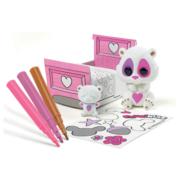Только есть одна проблема — они совершенно белые, а им так хочется быть яркими. Для этого есть три фломастера розового, фиолетового и коричневого цвета со специальной смывающейся формулой, чтобы игра не заканчивалась никогда. При этом в набор вложен лист подходящих по тематике стикеров для завершающего этапа. В процессе творчества развивается моторика рук, фантазия и воображение.
