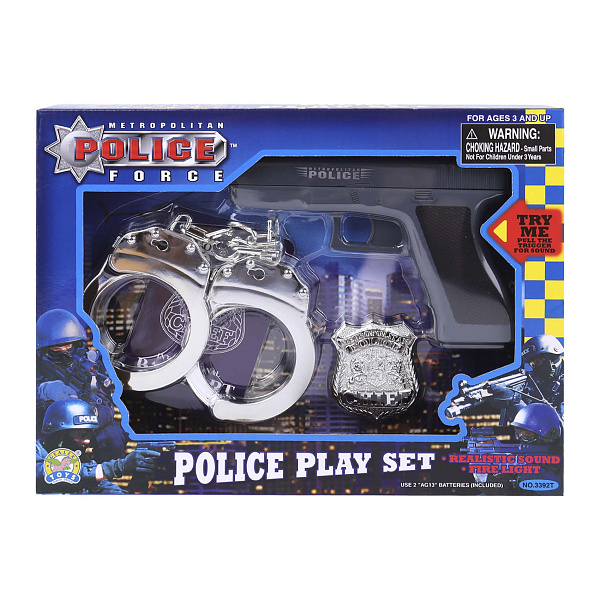 Пластиковый пистолет темно-синего цвета оснащен световыми и звуковыми эффектами, что сделает игру еще более захватывающей. Звуки выстрелов и мигающие огоньки позволят почувствовать себя в центре событий. Наручники из прочного пластика с ключами добавят интерактивности. Можно запереть и отпустить «преступника».
