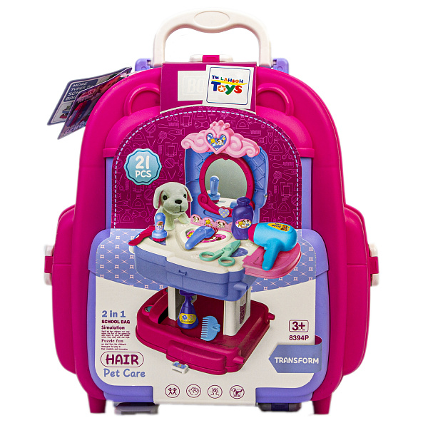 В комплекте чемоданчик грумера, косметический столик с зеркалом, инструменты для ухода за шерстью собаки, фен, пульверизатор, фигурка собачки. Всего в наборе 21 предмет, материал изготовления – пластик. С помощью этого комплекта ребенок может попрактиковаться в уходе за животным, почувствовать себя настоящим стилистом. Набор рекомендован детям старше 3 лет.