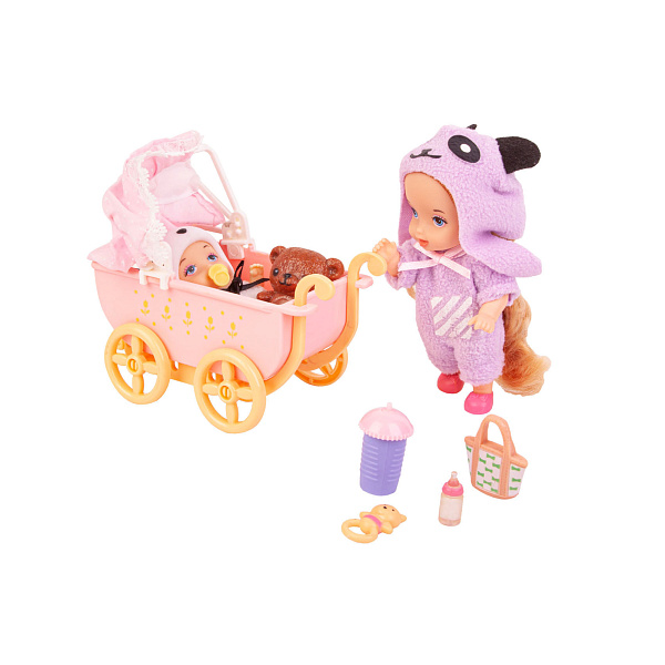 Подарить оригинальный набор можно каждой девочке старше трех лет. Ребенок с удовольствием начнет игру, располагая куколкой, малышом и коляской для него. Усложнить игровой процесс помогут дополнительные аксессуары: бутылочка, поильник, погремушка, сумочка, медвежонок. Внимание ребенка привлекает тщательная проработка мельчайших деталей, милые наряды, пустышка у младенца. В качестве комнаты можно легко использовать коробку. Подобные развлечения полезны для эмоционального и умственного развития детей. Они служат стимулом для воображения, формируют базовые бытовые и социальные навыки. Прочный сертифицированный пластик в составе безопасен для детского здоровья.