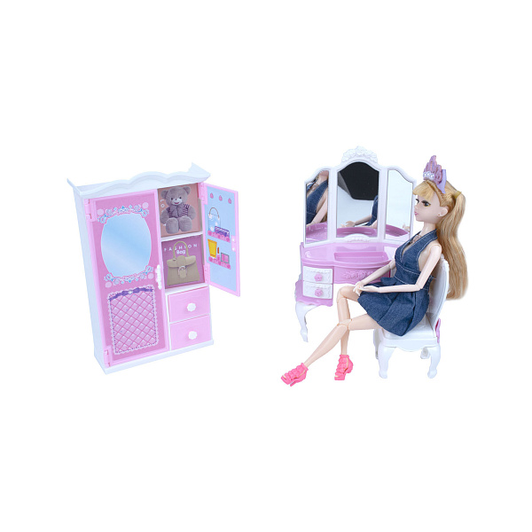 Компактный игровой набор, включающий мебель для обустройства спальной комнаты и красочную куклу среднего размера, понравится девочкам младшего возраста. Кукла имеет сгибающиеся конечности, что имеет важное значение для детей, проводящих большую часть свободного времени в ролевых играх с куклами. Такой кукле можно придать статичную или динамичную позу и даже сфотографировать. Длинные волосы на голове прошиты по всей поверхности и уложены в аккуратную прическу. В набор также входят платяной шкаф и туалетный столик со стулом. Элементы набора изготовлены из полимерных материалов. Игрушка подходит для детей старше 3 лет.