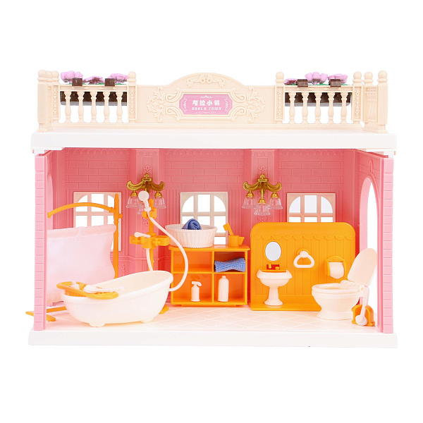 Комплектация включает в себя миниатюрную ванную комнату с акцентом на детализацию: ванна, раковина, унитаз и различные аксессуары, такие как полотенца и бутылочки с «косметикой». На втором этаже – терраса с цветами, добавляющая элемент декора.