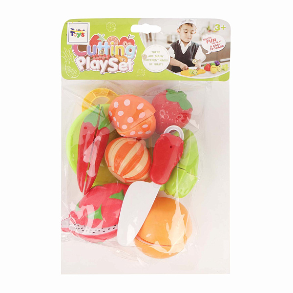 В набор входит: разделочная доска, нож, тарелка, перец, баклажан, кукуруза, апельсин, папайя, карамболь, клубника. Все фрукты имеют застёжку-липучку типа велкро, которая позволяет в процессе игры разрезать их пополам.
