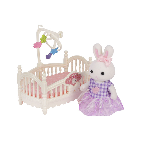 В небольшую картонную коробку с прозрачным окошком и подарочным оформлением упакованы различные игрушки. Маленький зайчик в фиолетовом платье изготовлен из флокса, а кроватка, мобиль и аксессуары для новорождённого ребёнка выполнены из качественного пластика, что гарантирует безопасность игрушки для детей любого возраста.
