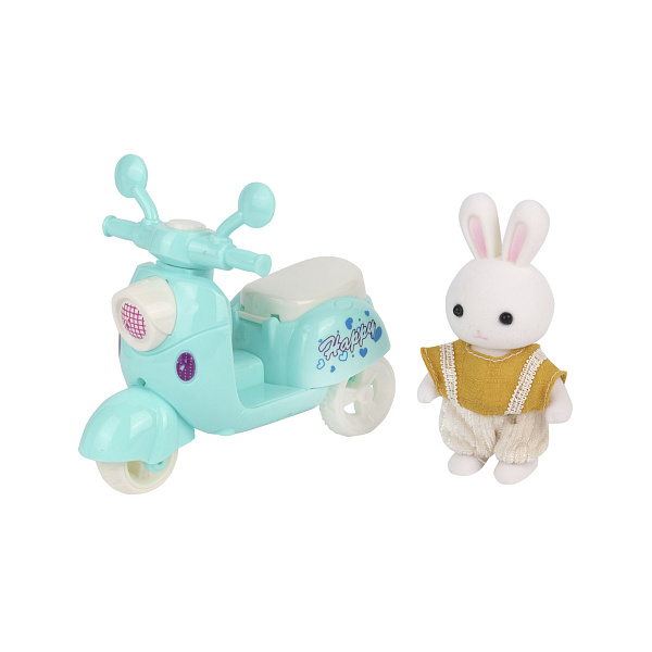 Этот игровой набор является отличным решением для ребёнка, который любит сюжетные игры и флоксовых питомцев. В набор входит маленький белый кролик в стильной одежде с аксессуарами (очки, браслет, корона), а также большой мопед в голубом цвете. Все игрушки упакованы в небольшую картонную коробку, они имеют компактный размер, поэтому их можно брать на улицу или в гости.