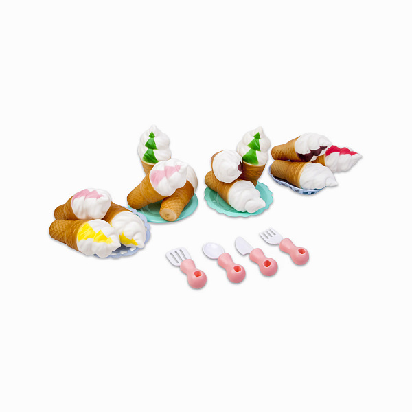Игрушечный десерт можно использовать не только для чаепития, но и для игр в магазин или кафе. В набор входит 12 вафельных рожков с мороженым, 4 блюдца и набор столовых приборов из 4 предметов. Набор изготовлен из сертифицированного пластика, который безопасен для детского использования. Рекомендуется для игр детям с 3 лет.