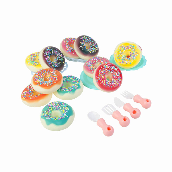 В комплект входит 12 пончиков шести разных цветов, 4 тарелочки и набор столовых приборов из 4 предметов (ложка, вилка, нож и лопатка). Пончики политы глазурью и посыпаны мелкими цветными шариками. Куклы будут в восторге от такого красивого угощения. Предметы набора комфортно хранить в коробочке-упаковке.