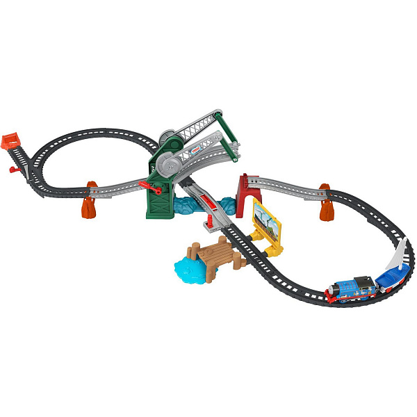 В набор входит моторизированный паровозик Томас и катер на колесах Скиф, а также рекламный щит, подъемный мост и детали трека. Всего 25 деталей и частей, которые совместимы с другими наборами «Томас и его друзья» (другие наборы и треки продаются отдельно). При приближении паровозика дети могут поднять мост, нажав на рычаг.
