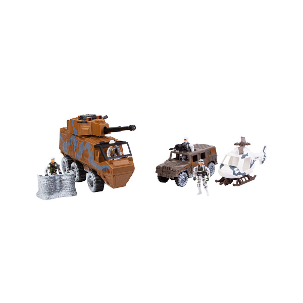 В большой красочной коробке представлены необходимые для широкомасштабной боевой операции материалы. Солдаты в полной амуниции могут легко выдвинуться на позиции при помощи армейского джипа и самоходной установки. А поддержку с воздуха им обеспечит вертолет. Такой подарок вызовет бурю восторга у каждого мальчика старше трех лет. Фигурки с подвижными конечностями можно вооружить автоматами. Спрятать технику от противника помогут специальные маскировочные сети. Воображение поможет детям придумать сложные сюжеты для игры, а придать динамику событиям помогут свет и звук. Питание игрушки получают от батареек. В производстве использован экологичный безопасный пластик, устойчивый к механическим нагрузкам.
